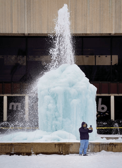 A cold day in hell? It was more like a week. Of course, I am talking about the devasting snow, ice, and freezing temperatures that hit most of Texas in mid-February. On Thursday, February 11, the precursor to disaster occurred when an icy freeway led to a 133-car pile-up on I-35W, leaving at least six persons dead and 65 others injured. Within hours of the crash, 26 fire department vehicles, 80 police cars, and 13 ambulances came to the scene. The cold then went from bad to worse. The temperature dipped below freezing in the afternoon of Saturday, February 13, and remained there until midday Friday, February 19. We reached the “low of the lows” temperature of three degrees on Tuesday, February 16, freezing our water everywhere, as this photo from The Dallas Morning News attests: